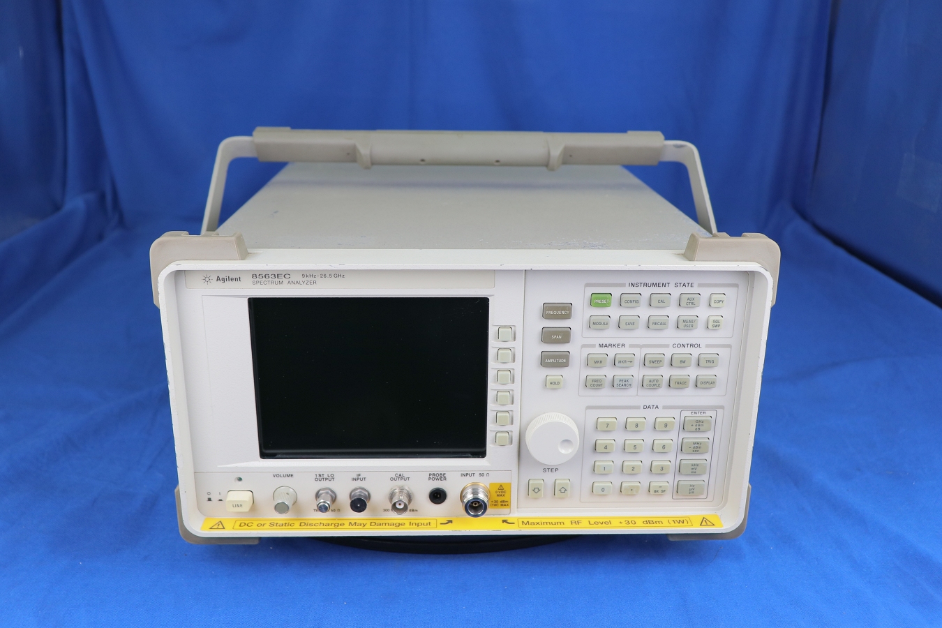 The Agilent 8563EC portable, color display microwave spectrum analyzer offers the measurement capability and performance previously found in larger, more expensive benchtop analyzers. This analyzer has a standard frequency range of 9 kHz to 26.5 GHz (preselected from 2.75 GHz to 26.5 GHz), with optional low-end frequency coverage to 30 Hz.