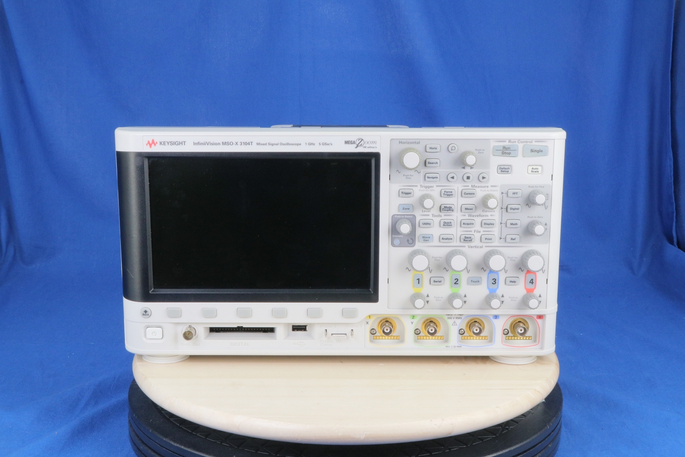 he MSOX3104T, 1 GHz oscilloscope provides 4 analog plus 16 digital channels, 4 Mpts memory, 1,000,000 waveforms/sec update rate and standard touch zone trigger with an 8.5-in capacitive touch screen.